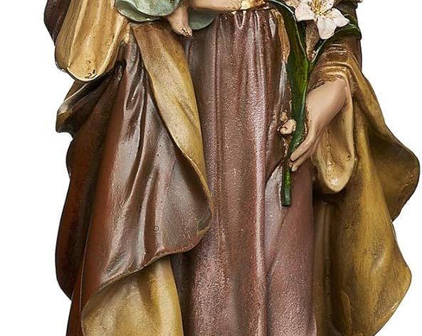 FEATURES: This lovely figure features St. Joseph with baby Jesus in one arm and lilies in the other. Measures approximately 10″ high x 4.25″ wide x 3.25″ deep.