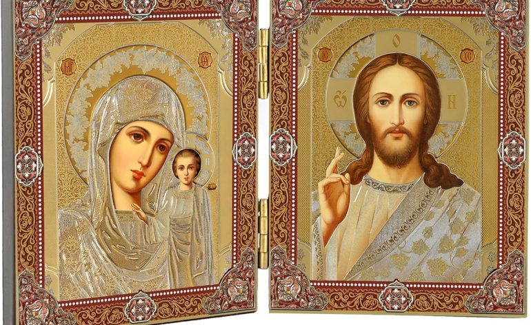 Gold silver icons mounted on wood – can be used a s a traveling icon diptych