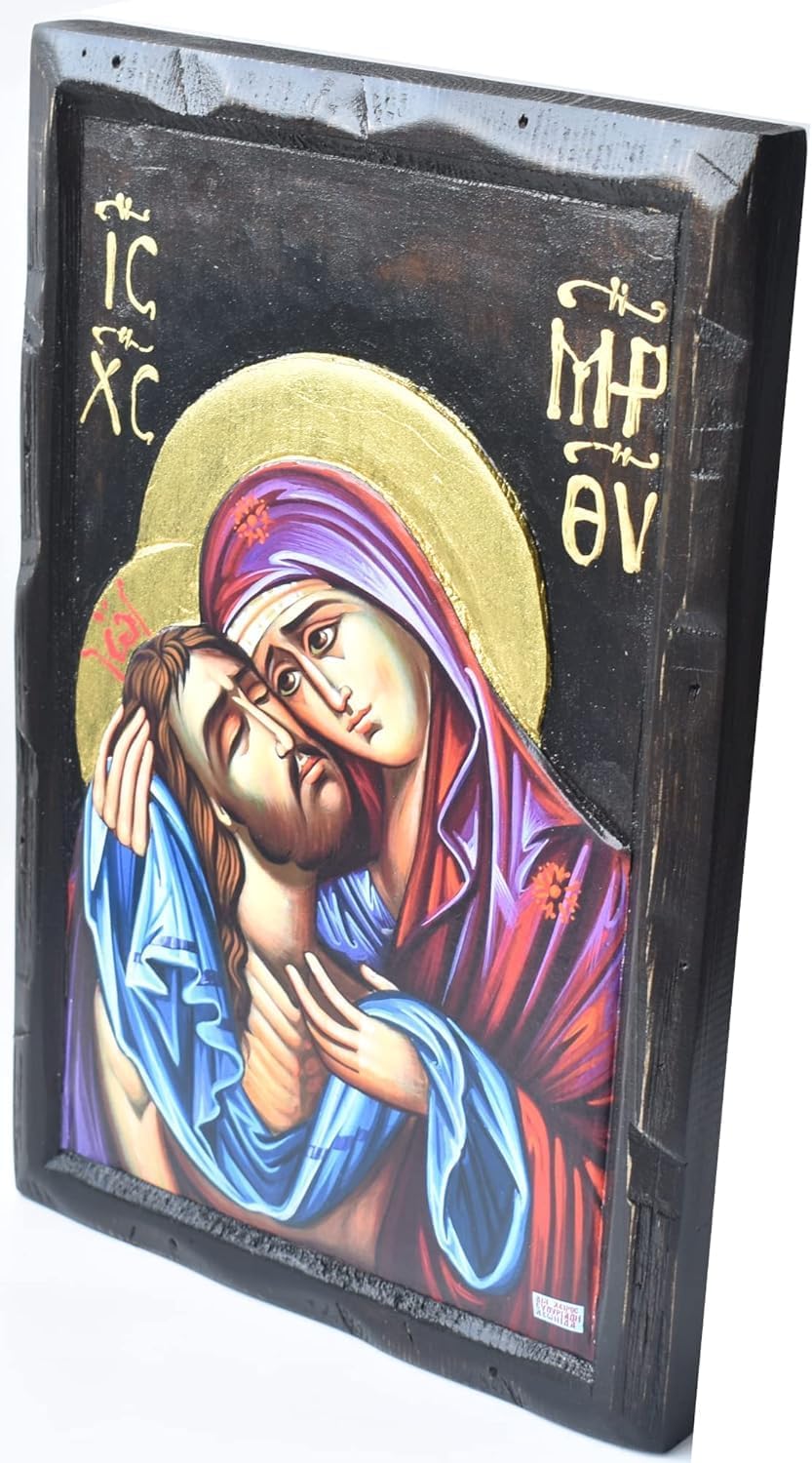 This is a traditional Orthodox Christian icon known as the Lamentation (Pietà), beautifully crafted using ancient iconography techniques on carved wood. The piece measures 20 x 30cm and showcases exquisite craftsmanship using noble materials. Materials and Techniques: Base: Hand-carved wooden panel with raised borders Gilding: 24K gold leaf, creating luminous halos and lettering Paint: Natural plant-based dyes mixed with egg yolk (egg tempera technique) Traditional Byzantine iconographic style Artistic Elements: Mary is depicted in deep red and purple robes, colors historically made from precious natural pigments Jesus wears light blue garments, the drapery showing fluid movement Gold lettering in the corners shows IC XC (identifying Jesus Christ) and MP ΘV (Mary, Mother of God) The black background creates dramatic contrast with the figures and gold work Raised carved edges create a frame-like border The painting demonstrates masterful use of the egg tempera technique, where powdered natural pigments are mixed with egg yolk to create rich, lasting colors that maintain their vibrancy. The 24K gold leaf catches and reflects light, creating a luminous effect that changes with viewing angle and lighting conditions. The piece preserves the traditional methods of icon creation that have been used for centuries, combining spiritual significance with historical craftsmanship. Each material – from the carved wood base to the natural pigments and pure gold – has been chosen for both its symbolic meaning and its enduring quality. The emotional depth of the scene is heightened by the quality of materials and execution, capturing both the divine nature of the subjects and the human emotion of the moment.