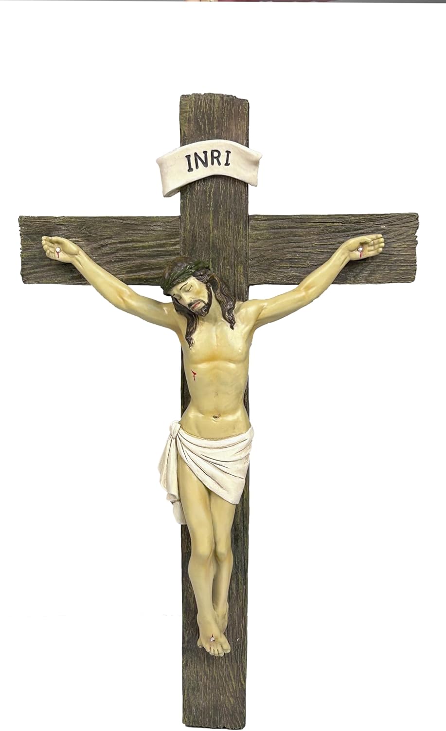 These Jorae exclusive creations are cast in quality designer resin with individually hand painted and polished lifelike detail in realistic body lines and prayerfully facial features. This holy crucifix statue shows a unique look of Jesus Christ sacrificed on the cross crucifixion which has wood texture look.
