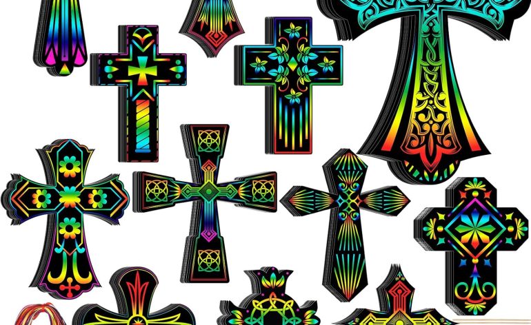RoundFunny 48 Pcs Religious Cross Scratch Cards Rainbow Crosses Craft Scratch Paper DIY Cross Ornaments Sunday Crafts with Wooden Stick and Ribbon for Church Christian