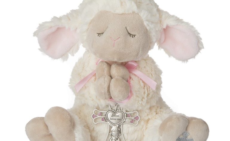 Set includes plush lamb with removable pendant crib cross in coordinating color. Crib cross reads “Jesus Loves Me” Removable pendant/crib cross Brand New in Original Packaging