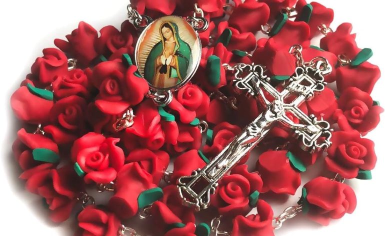 Christian Catholic Red Rose Garden Rosary Beads for Women or Men with Our Lady of Guadalupe Centerpiece and Antique Silver Crucifix