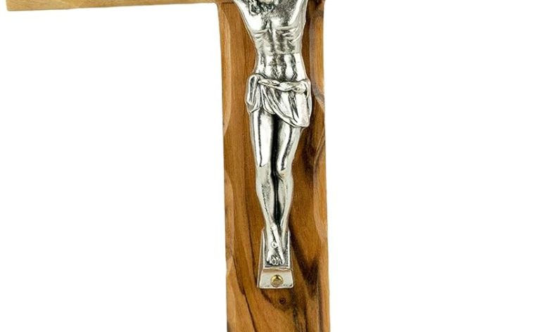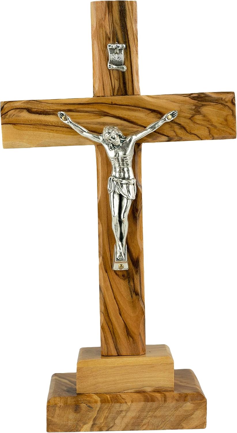 Catholic Standing OR Hanging Crucifix Cross, Certified Olive Wood Home Décor Table and Wall Cross from Jerusalem, Israel, Holy Land Tabletop Jesus Crucifixion Cross for Desk, Crucifijo Católico Cruz