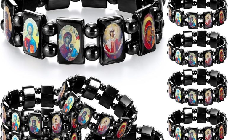 12 Pcs Orthodox Religious Hematite Bracelet with Saints Christian Elastic Bracelet with Holy Icons Prayer Gifts