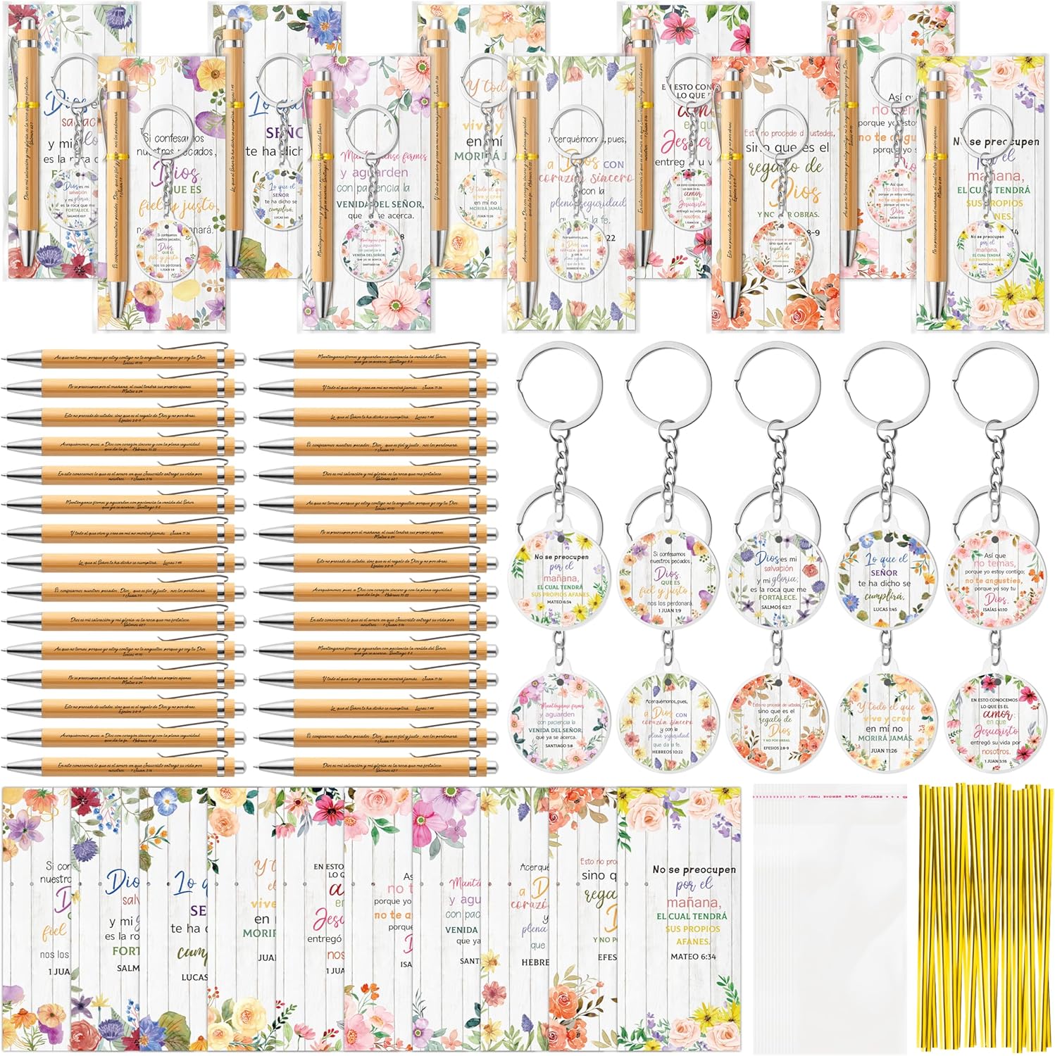 ANGOLIO 230Pcs Spanish Christian Floral Religious Gifts Bulk Regalos Cristianos En Español Bible Verse Bamboo Pen Keychain Inspirational Bookmark Religious Gift for Women Men Office Church Supplies