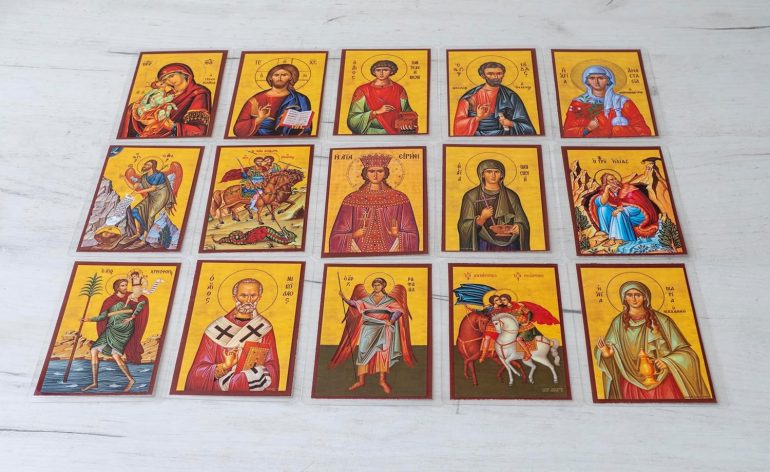 This set includes 15 laminated high-quality prayer cards featuring the image of Jesus Christ, the Virgin Mary, and various saints. each printed with the includes the apolytikion of the respective saint in Greek