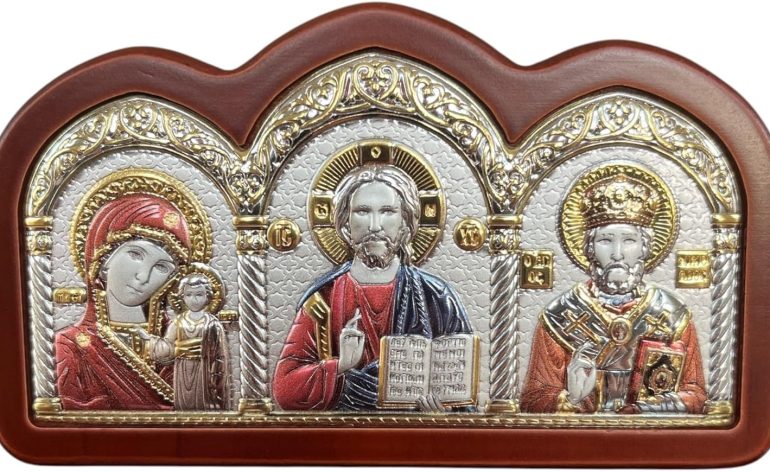 (AP-6/ GM) Savior, Kazan, Nicholas Arch Triptych Byzantine Silver Orthodox Christian Icon/Greek Handmade (Red, 5 x 2 1/2) (Color)