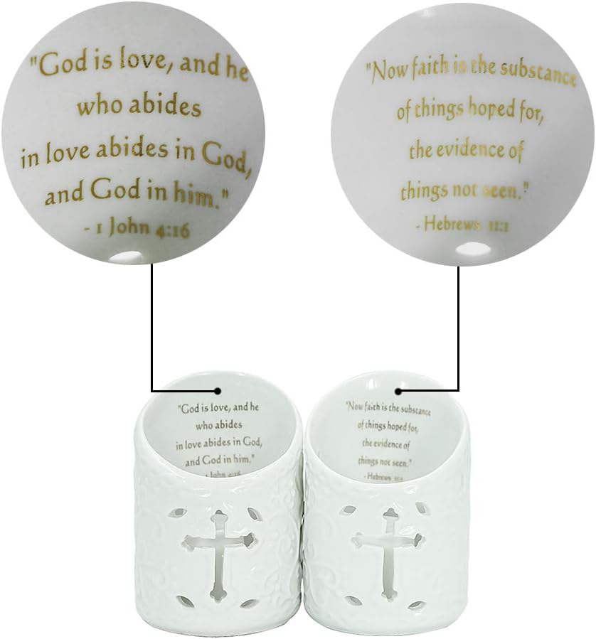 Dreamseden Set of 2 Ceramic Christian Cross Tealight Candle Holder with Bible Verses Include Flickering LED Flameless Tea Light Candles for Wedding and Home Decor