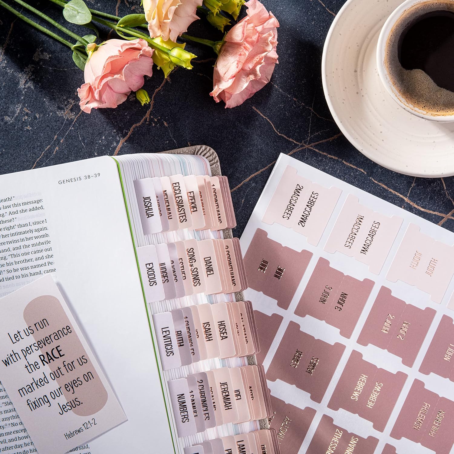 DiverseBee Laminated Bible Tabs (Rose Gold Embossed Lettering), Bible Journaling Supplies, Bible Book Tabs, Christian Gift, 73 Bible Tabs for Women and Men, Includes 4 Blank Tabs (Pearl)