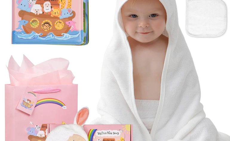 My First Noahs Ark 7 pcs Baptism Gift Set, Dedication, Christening and Baptism Gifts for Girl and Newborn Baby, Includes Washcloth and Hooded Towel,Baby Bath Book, 3 Bath Toys and Gift Bag