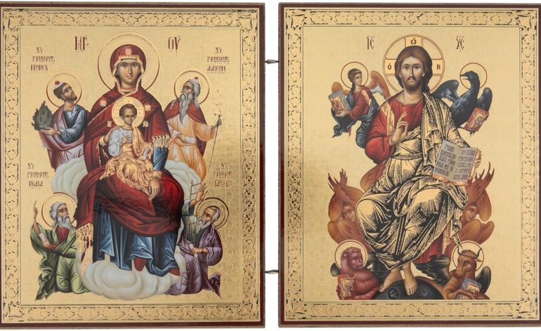 Traditional Orthodox Diptych – Features Theotokos with Child Christ on the left and Christ Pantocrator on the right. Symbolism – Christ’s halo contains the Greek letters Ο Ω Ν (“He Who Is”); ΜΡ ΘΥ abbreviates “Mother of God”; IC XC stands for “Jesus Christ.”