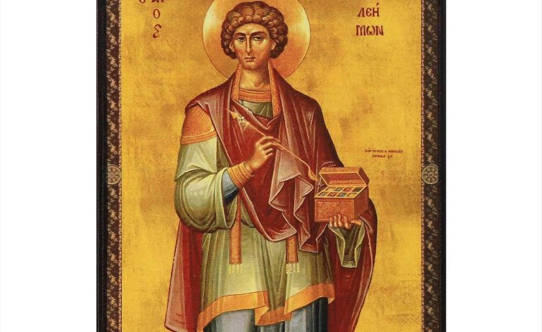 This wooden icon features a beautiful depiction of a Saint Pantaleon in Byzantine style.