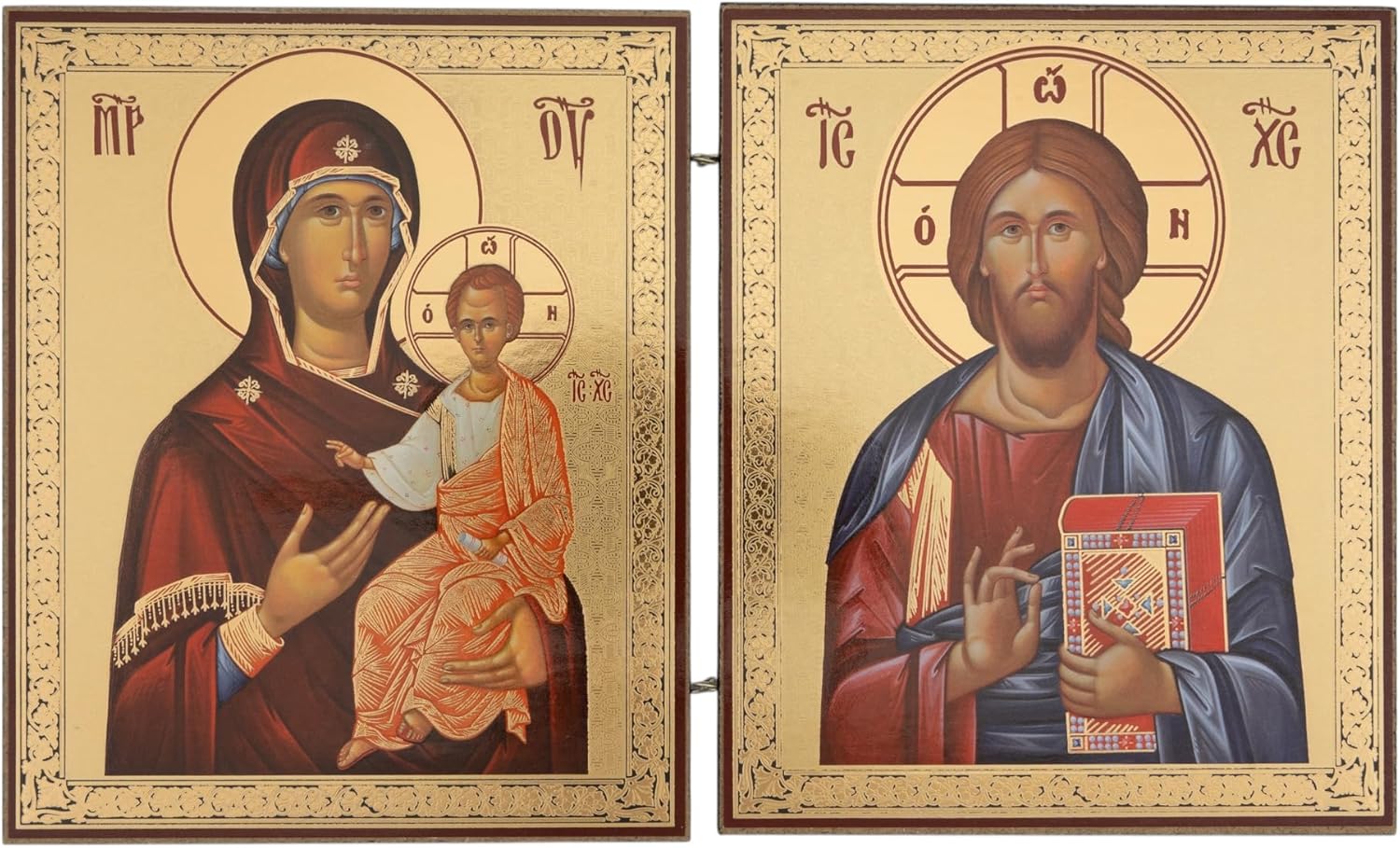 Theotokos and Christ Pantocrator Orthodox Icon Diptych Compact and Elegant Size – Measures approximately 5.3 x 4.3 inches (13.5 x 11 cm) when closed, and 5.3 x 9 inches (13.5 x 23 cm) when open. Perfect for home altars, prayer corners, or travel. A meaningful spiritual gift and a beautiful reminder of faith for any Orthodox Christian home.