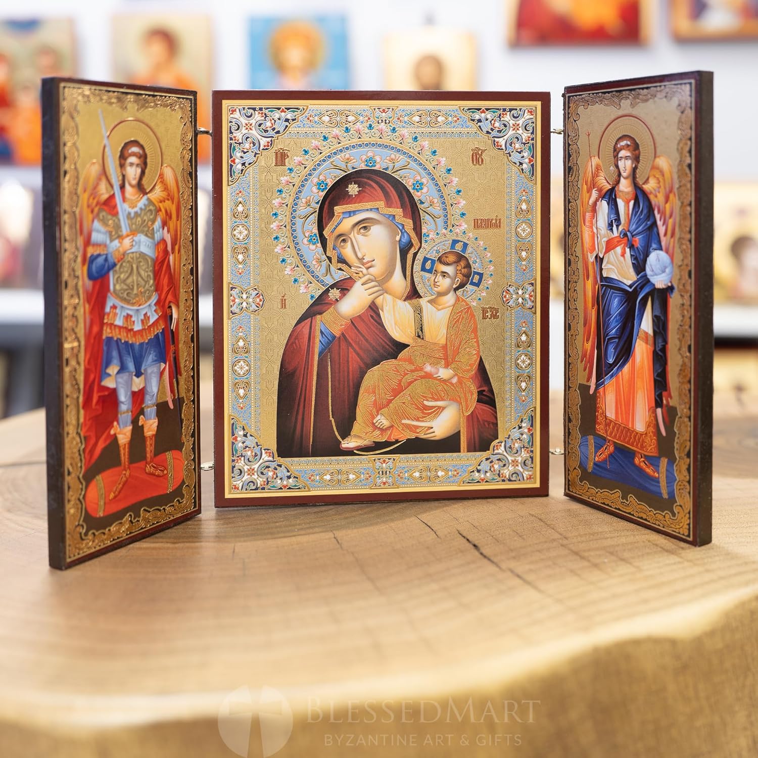 BlessedMart Orthodox Triptych Icon – Folding Wooden Byzantine Icon – Christian Religious Home Decor & Gift (Theotokos Paramythia)