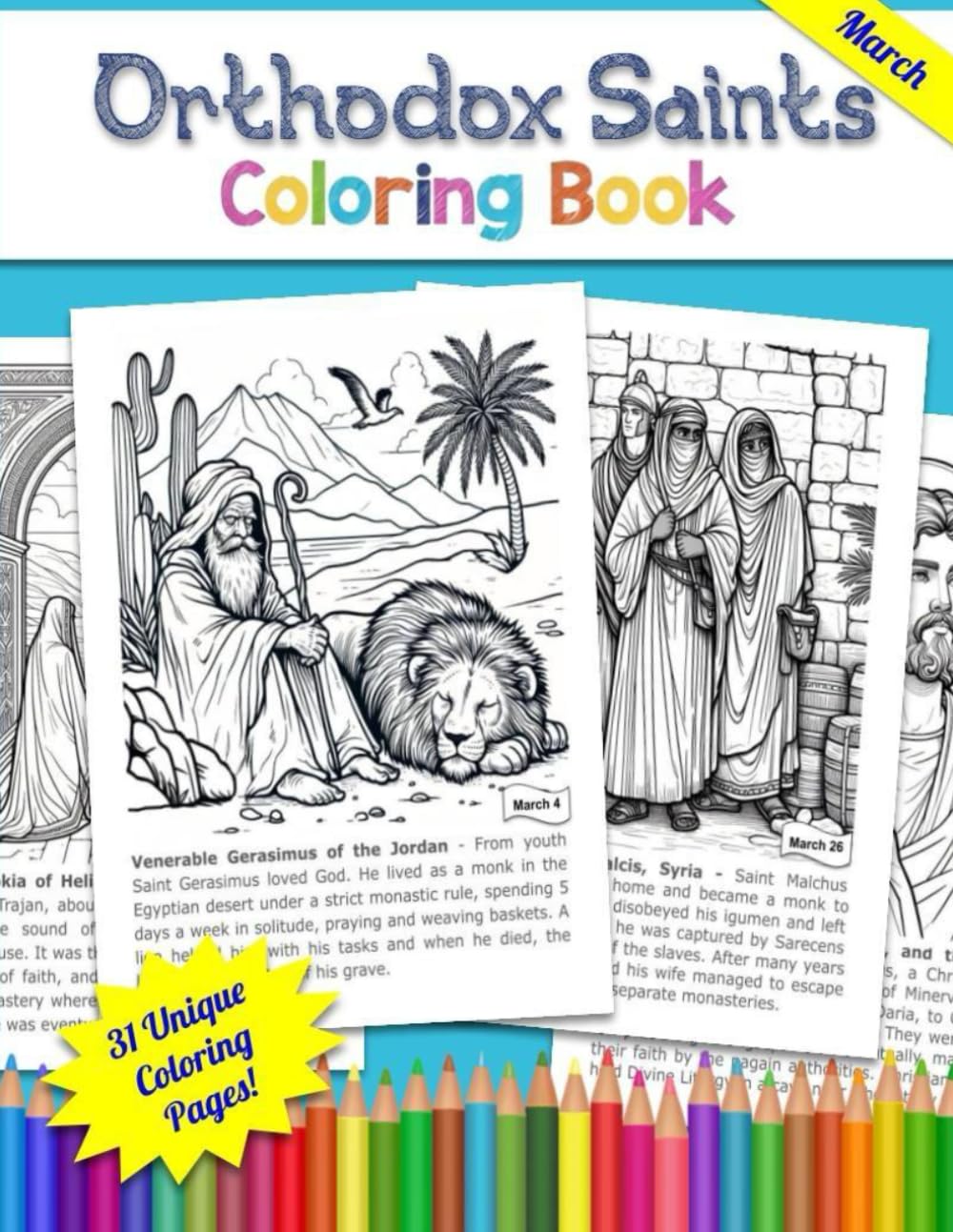 March Orthodox Saints Coloring Book is part of a series of 12 monthly coloring books that feature a new Saint each day, along with a small bit of information about their life. The hope is that this humble set of books both educates and introduces people of all ages to the blessed lives of the Holy Saints and Martyrs. This collection is a great addition to any Orthodox Sunday School class, or a quiet activity for a sanctuary. Featured Saints in March are:Martyr Eudokia of HeliopolisHieromartyr Theodotus, Bishop of CyreniaSaint PiamounVenerable Gerasimus of the JordanMartyr Conon of Isauria42 Martyrs of Ammoria in PhrygiaVenerable Paul the SimpleSaint Theophylactus, Bishop of Nicomedia40 Holy Martyrs of SebasteMartyr Quadratus and those with him at CorinthSaint Sophronius, Patriarch of JerusalemVenerable Theophanes the Confessor of SigrianeHieromartyr Publius, Bishop of AthensVenerable Benedict of NursiaHieromartyr Alexander of Sίdē, in PamphyliaMartyr Sabinus of EgyptVenerable Alexis the Man of GodRepose of Saint Nikolai of ZhichaMartyrs Chrysanthus and DariaMartyr Photini the Samaritan WomanSaint James the Confessor, Bishop of CataniaMartyr Drosίs, daughter of Emperor TrajanVenerable Nikon, Abbot of the Kiev Far CavesSaint Artemon, Bishop of SeleuciaThe AnnunciationSaint Malchus of Chalcis, SyriaMartyr Matrona of ThessalonicaVenerable Hilarion the New, Abbot of PeleketeHieromartyr Mark, Bishop of ArethusaVenerable John Climacus of SinaiSaint Hypatius the Wonderworker