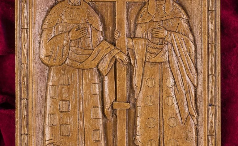 St. Constantine and St. Helen Greek Christian Orthodox Icon Plaque made with beeswax, mastic and incense