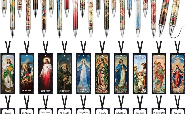 Bible Gifts Set: you will get a set of 40 pieces of christian gifts containing 20 ballpoint pens, 20 Catholic devotional prayer bookmarks, which feature the following character theme, such as Saint Benedict, Saint Jude, Saint Michael, Saint Christopher, Holy Family Sign, Our Lady of Guadalupe, Our Lady of Miracles, Our Lady of Untie, Divine Mercy, Our Lady of Grace, these bookmarks with corresponding scriptures make an ideal gift for those in need of healing, comfort or prayer