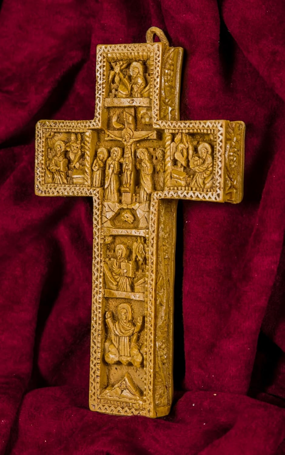High quality crucifix crafted in a unique way with superior natural materials. Cross with details and Ambelos 8cm x 13cm (3.14inches x 5.11inches) #235 Made with pure beeswax, mastic and incense exactly like the first Christian icons of Luke the Evangelist. No other materials or chemicals of any sorts are used. Hand-carved, solid beeswax with great emphasis on detail It emits a very distinct odor due to the incense from Mount Athos creating an atmosphere similar to an Orthodox church or to a Monastery. We really wish we could transmit this pleasant odor over the internet for you to smell! No one else make them like this today! This is a truly unique item, the perfect spiritual gift for your Christian Orthodox friend or for your own prayer corner