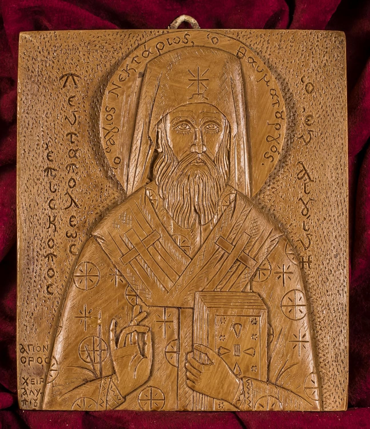 High quality icon/plaque crafted in a unique way with superior natural materials. St. Nektarios of Aegina 12cm x 15cm (4.72inches x 5.90inches) #136 Made with pure beeswax, mastic and incense exactly like the first Christian icons of Luke the Evangelist. No other materials or chemicals of any sorts are used. Hand-carved, solid beeswax with great emphasis on detail It emits a very distinct odor due to the incense from Mount Athos creating an atmosphere similar to an Orthodox church or to a Monastery. We really wish we could transmit this pleasant odor over the internet for you to smell! No one else make them like this today! This is a truly unique item, the perfect spiritual gift for your Christian Orthodox friend or for your own prayer corner