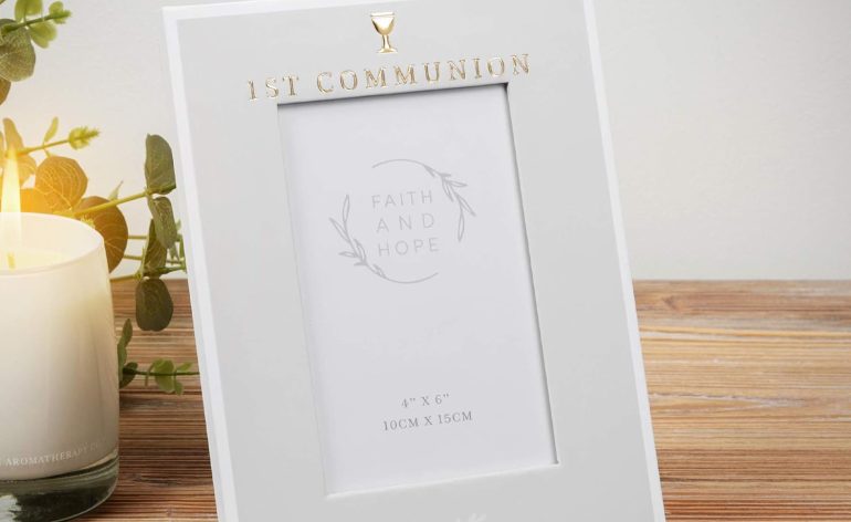 Keep a precious keepsake from their 1ST COMMUNION with this gold foiled photo frame. Details: – Soft grey and crisp white paper wrapped wooden photo frame – Gold foil embossed 1ST COMMUNION title with golden goblet icon – 4″ x 6″ (10 x 15cm) portrait aperture – Easel style standing strut – Branded gift box. A perfect gift to celebrate a once in a lifetime religious occasion.