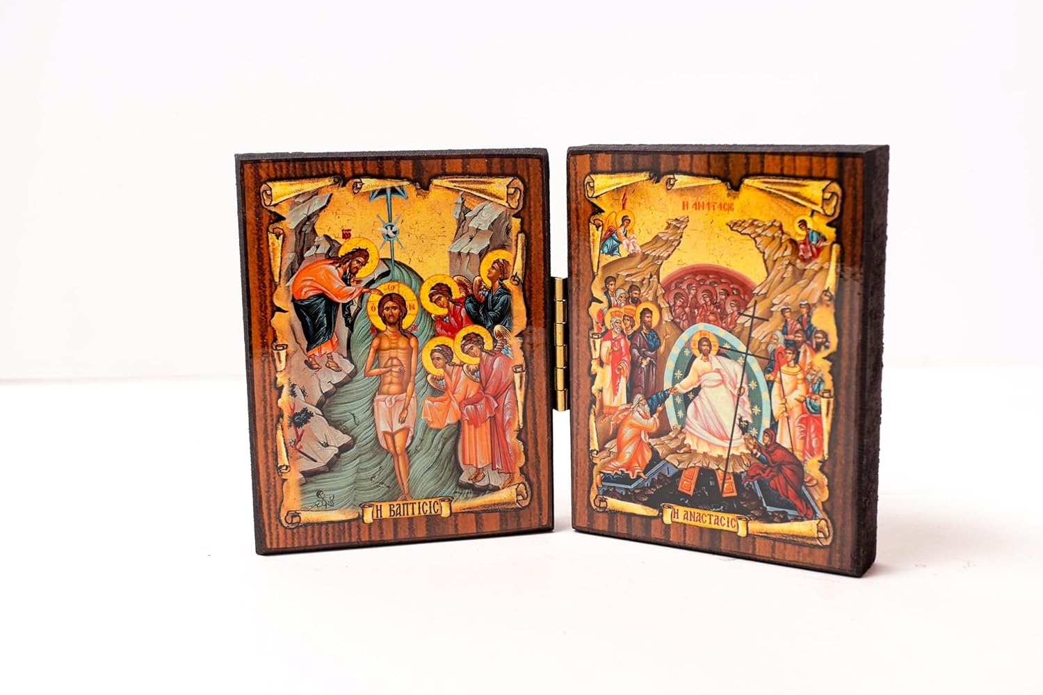 Diptych Wooden Icon with the Baptism and Resurrection of Jesus Christ – Greek Christian Icon, Home Decor, and Orthodox Gift (2.36 x 3.35 in 6 x 8.5 cm)