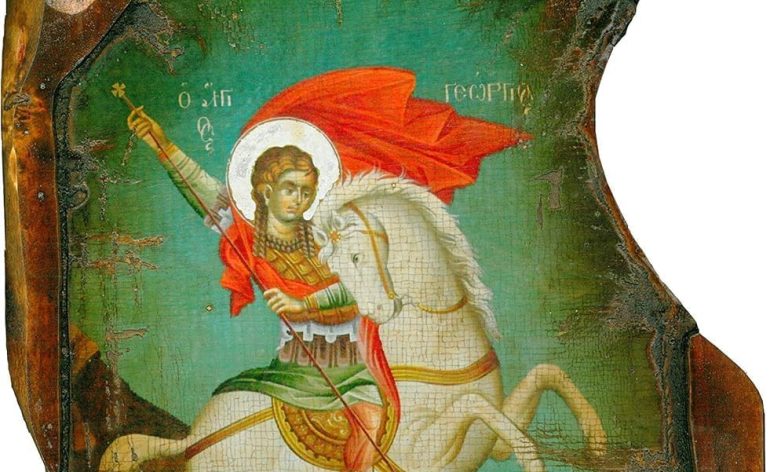 Handmade Greek Orthodox Icon of Saint George on Canvas – Wooden Christian Wall Art – Byzantine Style Religious Decor / M77