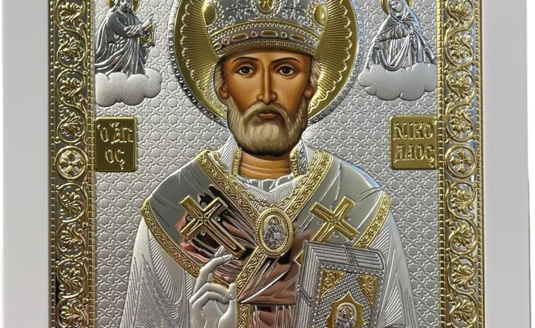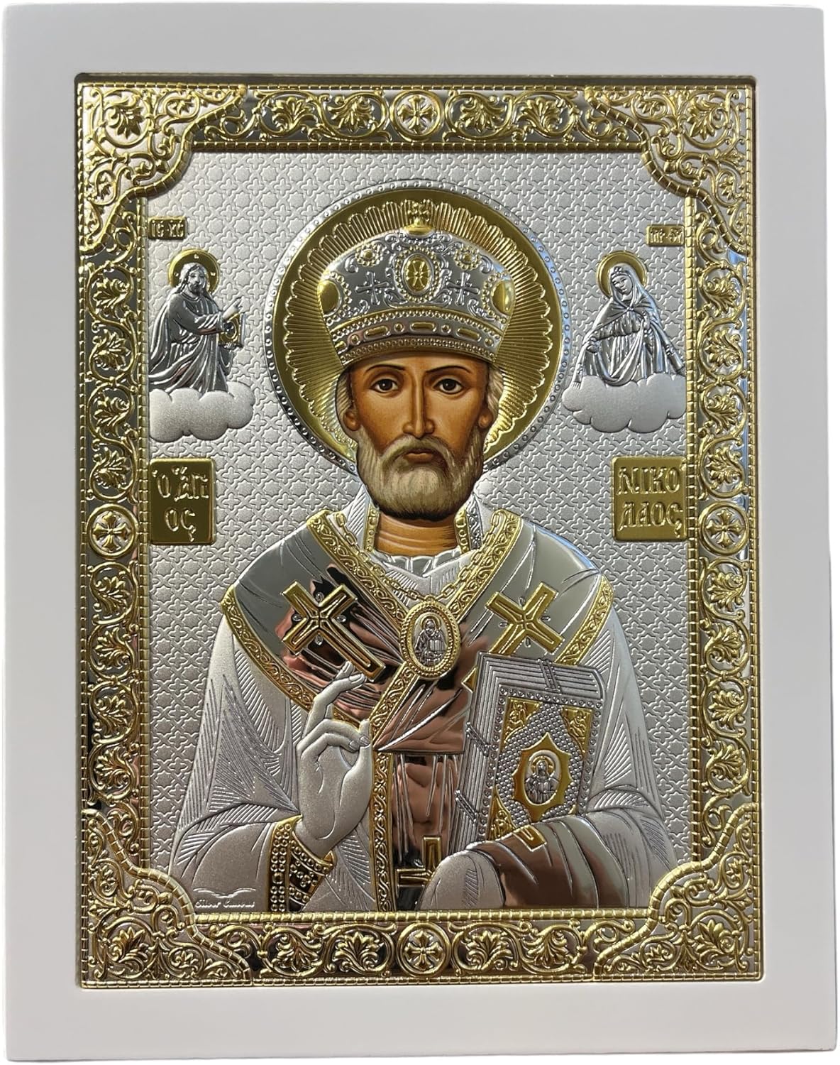 Silver Canvas (PR-5/003G/B) Saint Nicholas Byzantine Silver Orthodox Icon/Greek Handmade (White, 9 1/2 x 7 1/4)