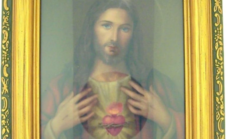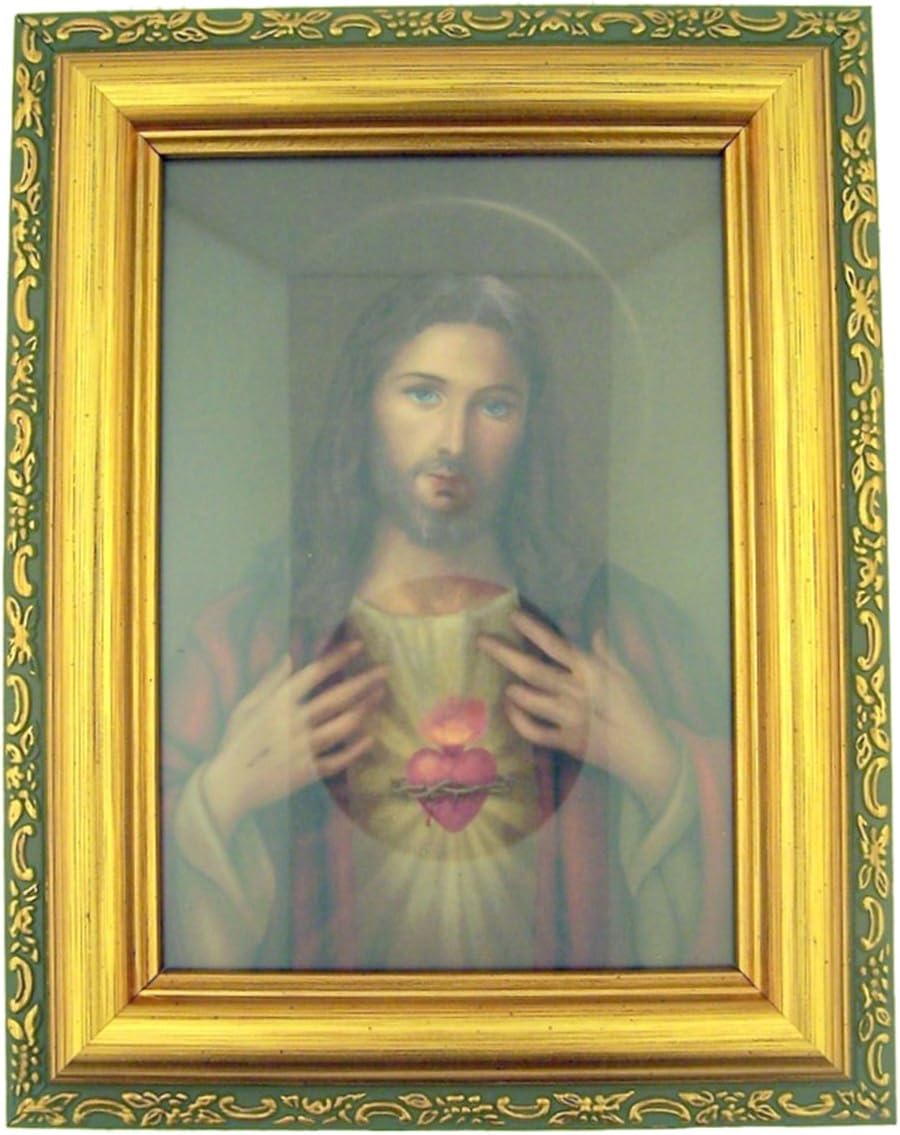 Italian Lithograph Sacred Heart of Jesus Print in Antique Gold Tone Frame with Glass, 6 1/2 Inch