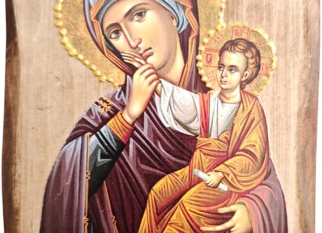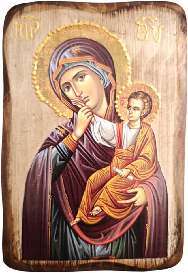 Handmade Wooden Greek Christian Orthodox Icon of The Mother of Jesus & Christ /Mp7