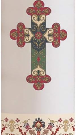 Material – 100% Paraffin Wax, Water Transfer Label – Size – 3 Inch (Dia) x 12 Inch (H) – Hand-Tooled to be Blemish Free – Features a Coronation Motif – This is a Great way to Decorate an Altar