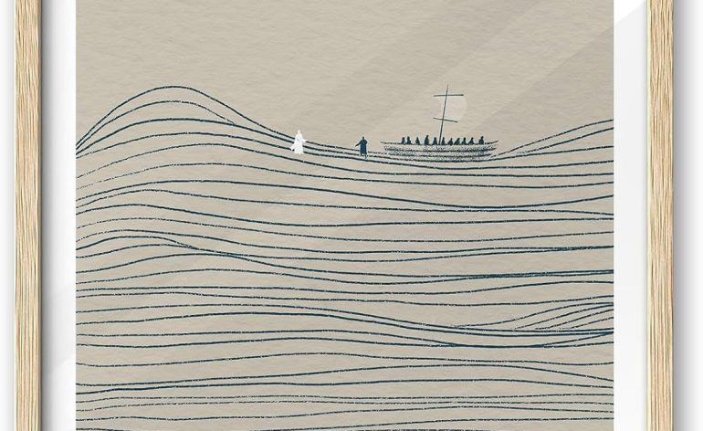 Inspirational Bible Verse Art: Featuring a minimalist sketch of the iconic scene of Jesus and Peter walking on water, this artwork brings faith and inspiration into your home. The subtle inclusion of Bible verses adds spiritual depth to the design.
