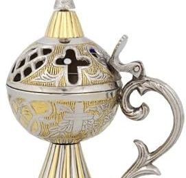 Christian Orthodox Censer Dimensions : Height : 14 cm 5.51 in christian censer in Gold/Nickel color Description: Censers are vessels made for burning incense. Continue Reading