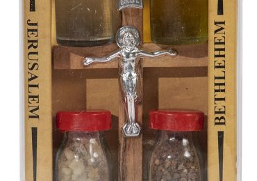 This decorative box containing: - Olive Oil from Bethlehem with blassing of Church of Nativity Bethlehem. - Holy Soil from Jerusalem. - Holy water Continue Reading