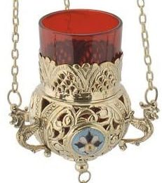 Orthodox Greek Christian Bronze Hanging Votive Vigil Oil Lamp with Chain and Red Glass – 9685b