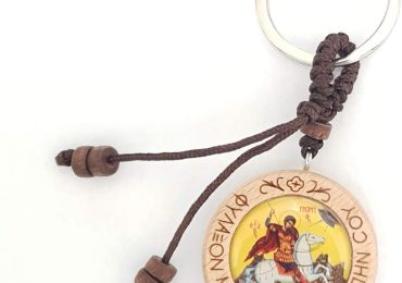 Wooden key chain with Saint George icon, 9 cm in length with stainless steel key ring.
